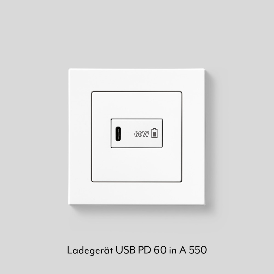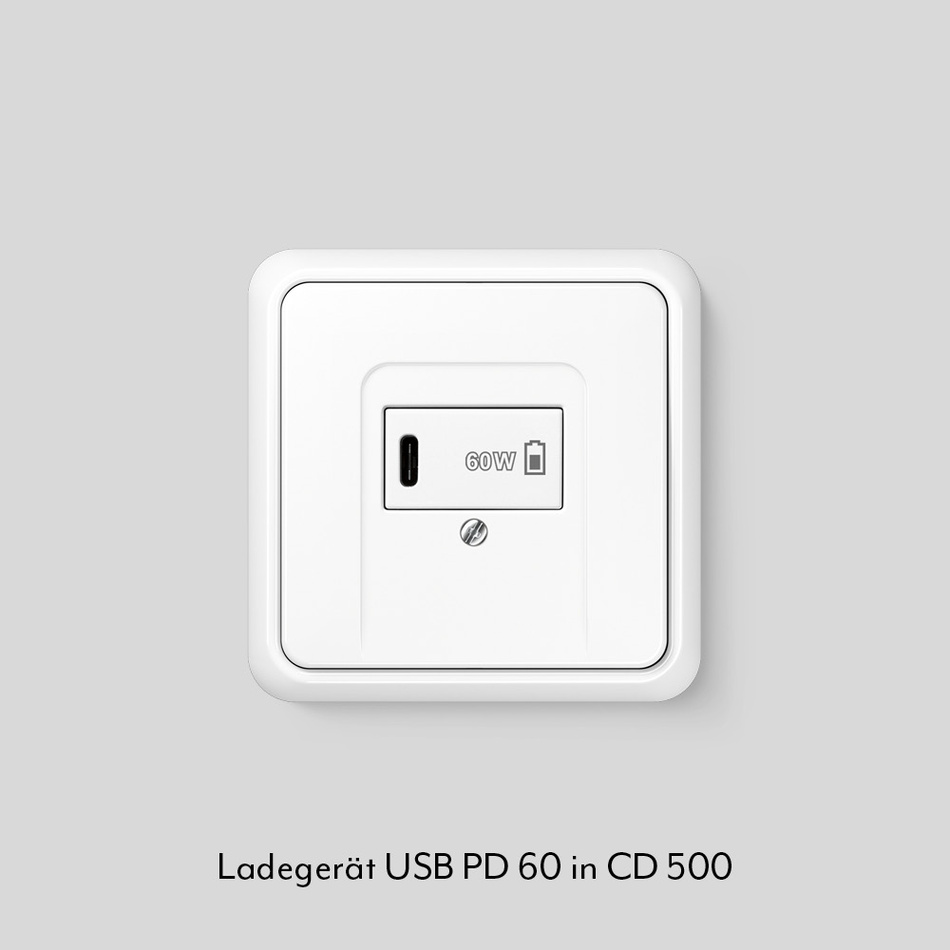 Ab Anfang 2026 sind USB-C-Anschlüsse für alle neuen Geräte Pflicht. JUNG bietet mit dem Ladegerät USB PD 60 eine platzsparende Lösung zum Laden von Akkus mit bis zu 60 Watt mit USB-C Port. Die Ladegeräte sind mit den Serien A, CD und LS kompatibel.